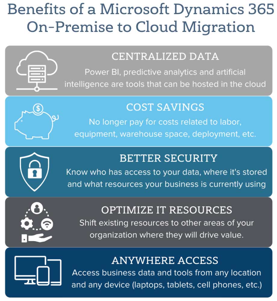 Building a more agile business is the goal for your Dynamics 365 on-premises to online migration. But—if you are looking to get more specific, here’s a look at some of the biggest benefits of moving to the cloud: